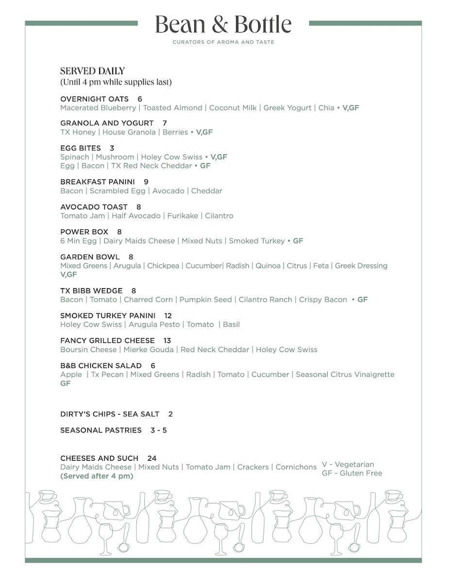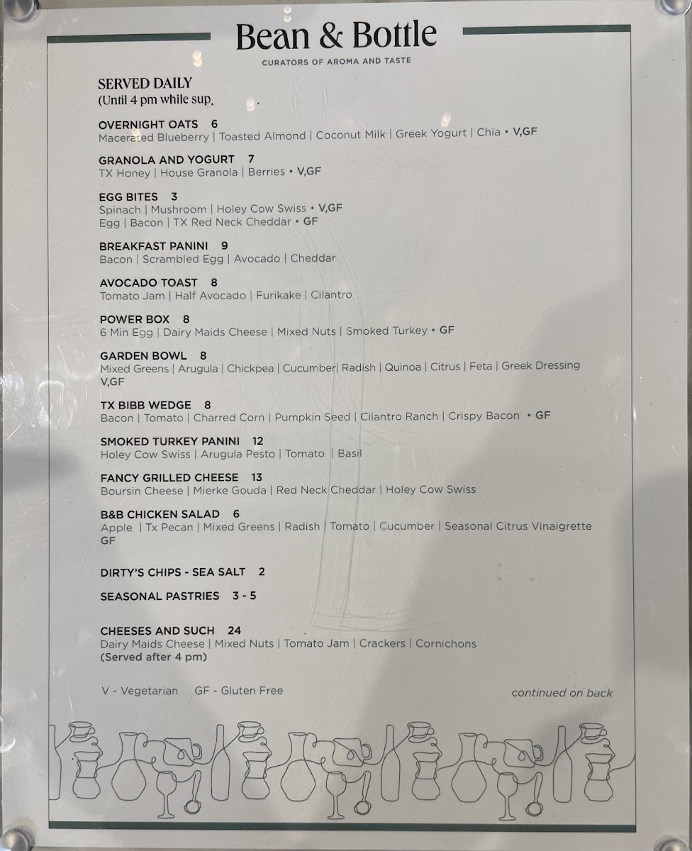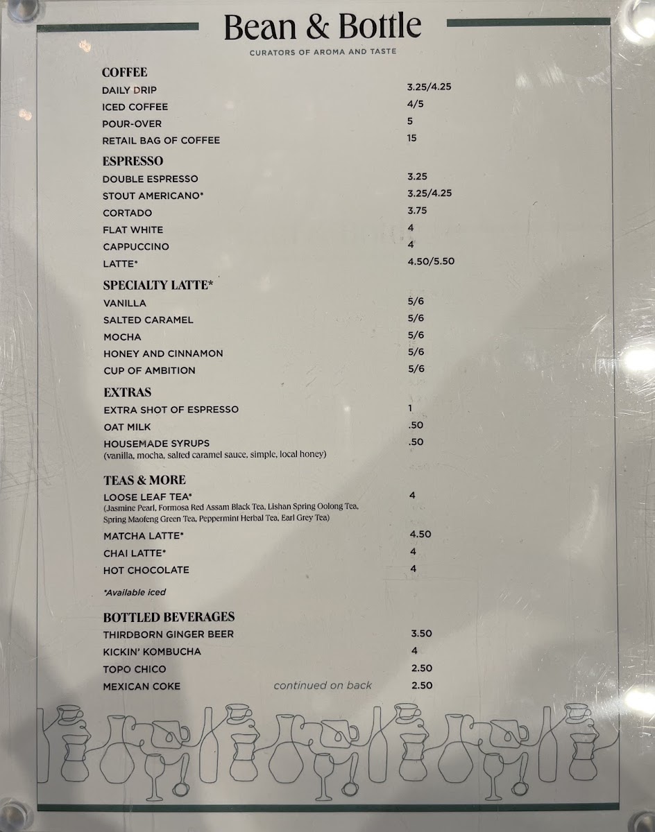 Welcome to Bean & Bottle, a hidden gem located at 9655 Katy Fwy Suite 100, Houston, TX. This charming café beautifully combines the worlds of coffee and wine, creating a unique ambiance where patrons can unwind and indulge. The menu features artisanal coffee and a delightful selection of wines and champagnes, perfect for any occasion.